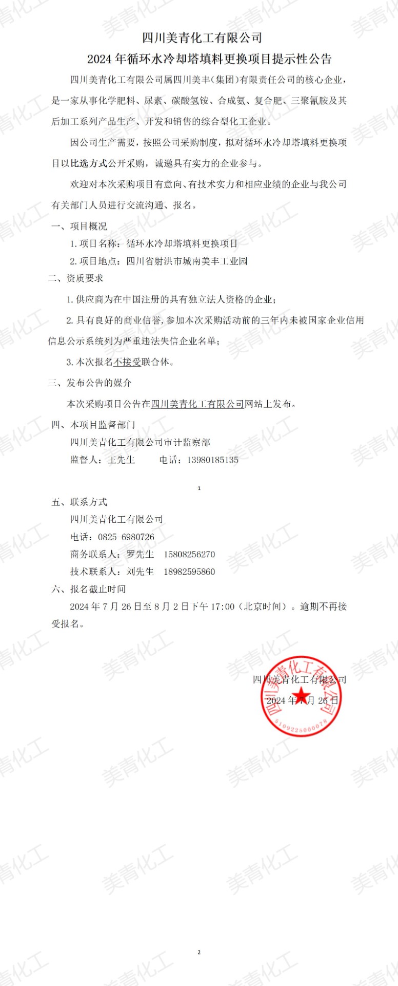 2024-07-262024年循環(huán)水冷卻塔填料更換項目提示性公告
