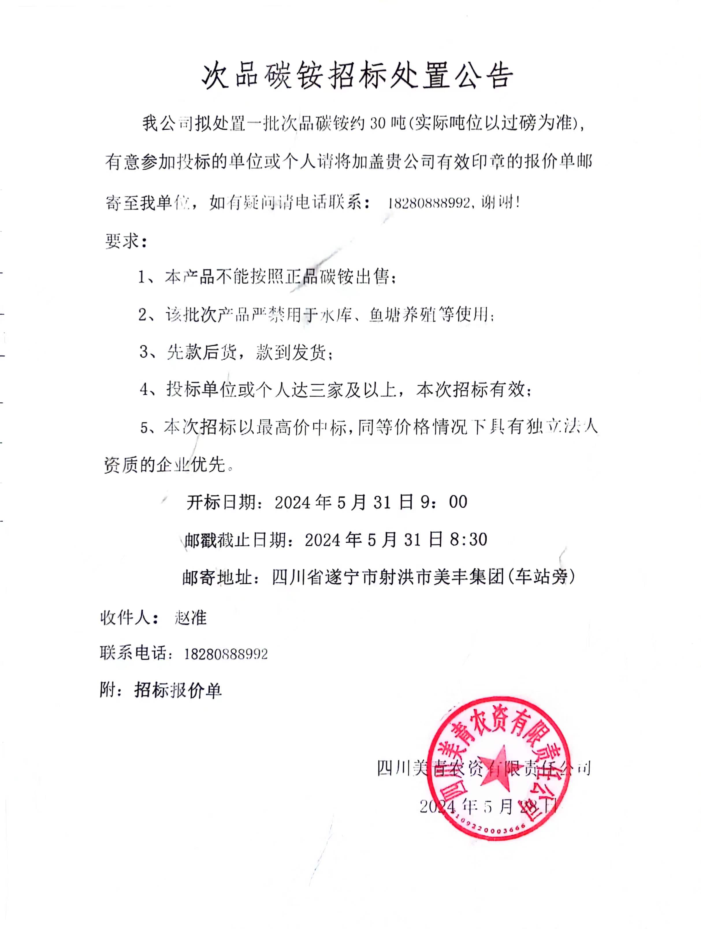 2024-05-29次品碳銨招標處置公告