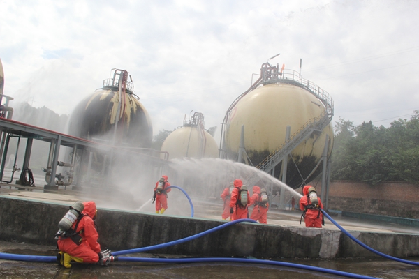 此次演練情景模擬為我市各縣(市、區(qū))、園區(qū)突降大暴雨,涪江、郪江遂寧段水位持續(xù)上漲,個別地方即將達到保證水位,射洪市、經(jīng)開區(qū)、船山區(qū)、蓬溪縣多地多點發(fā)生洪水漫壩、城市內(nèi)澇、山體滑坡、道路沖毀、人員被困等洪澇及次生災(zāi)害。我公司液氨罐區(qū)D號球罐被山洪沖擊受損,發(fā)生液氨泄漏。災(zāi)情發(fā)生后,射洪市和我公司立即啟動?;沸孤秾m棏?yīng)急預(yù)案,組建現(xiàn)場指揮部,組織市直有關(guān)部門緊急趕赴災(zāi)害現(xiàn)場,開展緊急疏散、力量調(diào)度、物資調(diào)集、環(huán)境監(jiān)測、倒罐搶修等災(zāi)害應(yīng)對處置工作。